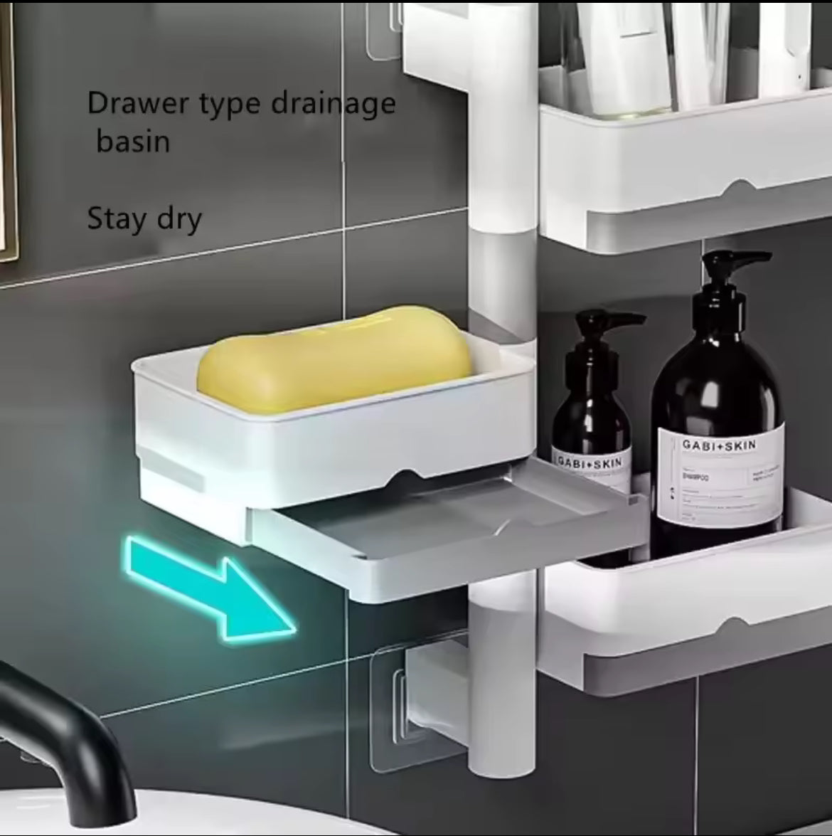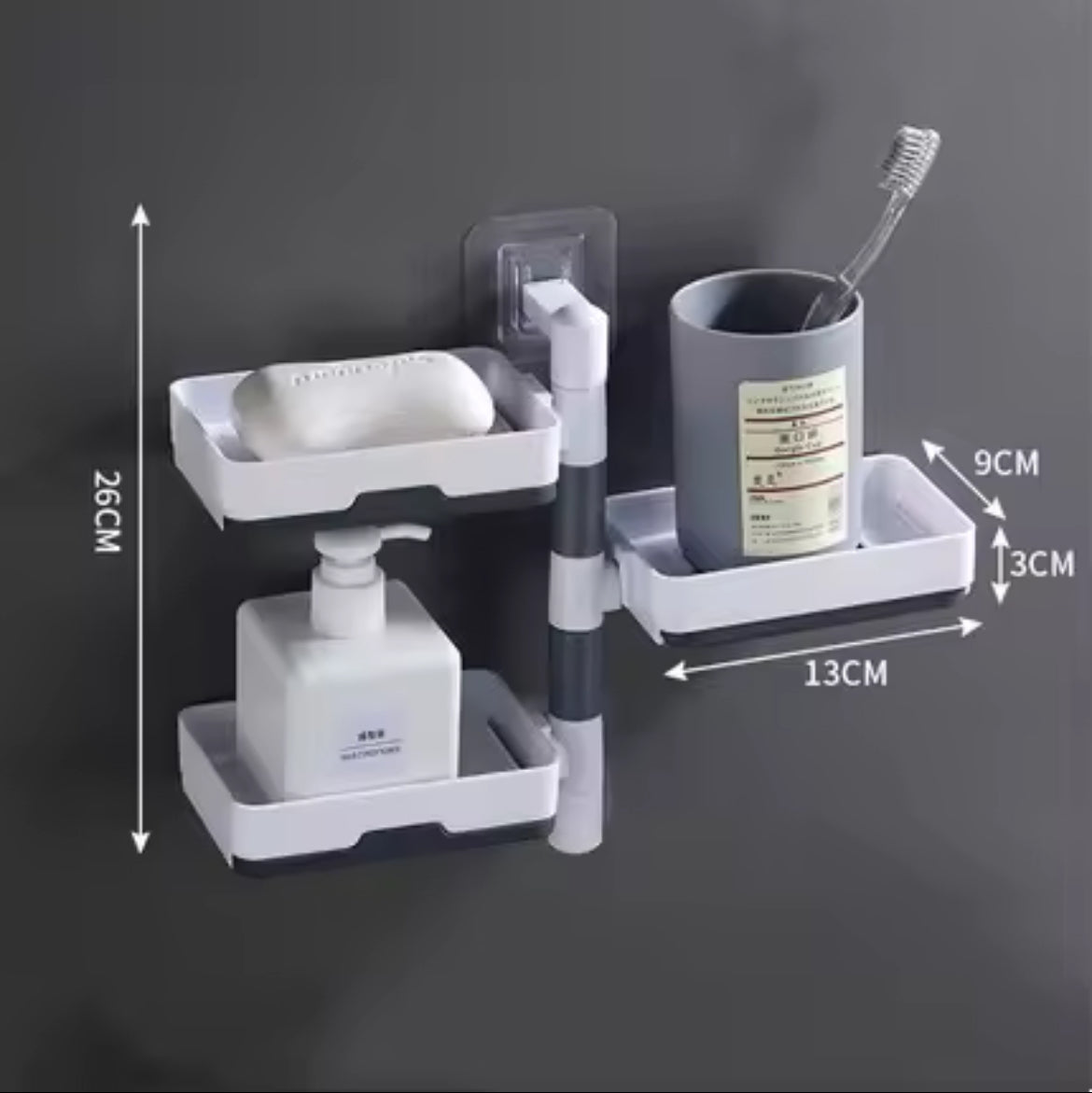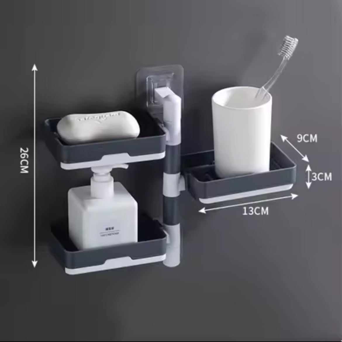 Organiseur mural de salle de bain pratique et moderne, conçu pour optimiser l’espace et garder vos accessoires toujours à portée de main. Fabriqué en plastique résistant et étanche, il se fixe facilement sans perçage grâce à son support adhésif solide. Idéal pour ranger le savon, le distributeur de gel, le gobelet à brosses à dents et autres petits objets du quotidien. • Dimensions totales : 26 cm de hauteur